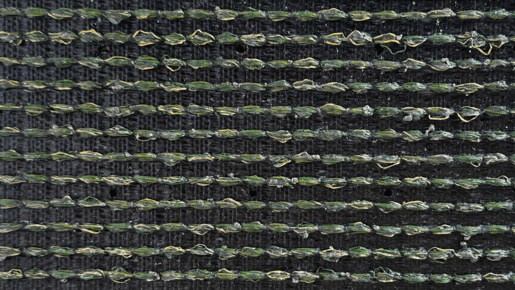人工芝の最大の悩みである「芝が寝てしまう(ヘタリ)」問題を、パイル(芝葉)の形状を工夫することで解決しています。