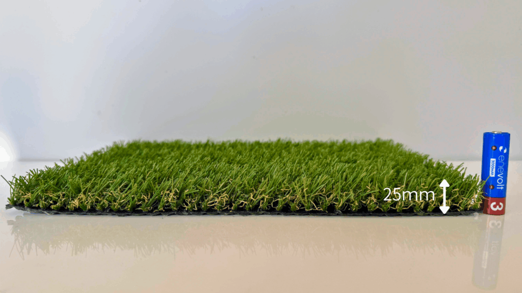 安価な平らな芝とは異なり、断面を「W型」に加工。この形状が柱のような役割を果たし、踏まれてもスッと起き上がる高い復元力を実現しました。人気な25mmの背高でふかふかの感触が長続きするため、長く美しい景観を保てます。