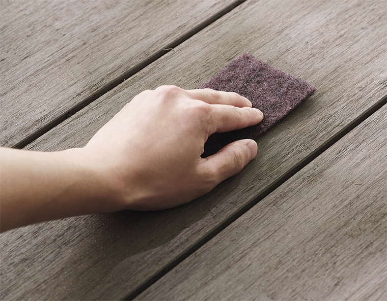 人工木の場合は家庭用の中性洗剤を使い、デッキブラシで木目に沿ってこすり洗いをした後、しっかりと水で洗い流します。