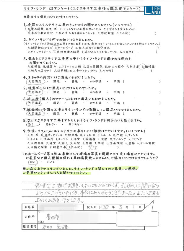 無理な工期でお願いしたにもかかわらず、引越しに間に合うよう仕上げて頂き、本当にありがとうございました。