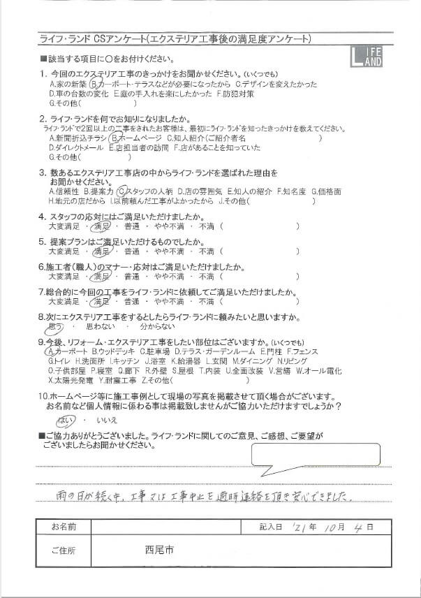 | 工事のきっかけ | カーポート・テラスなどが必要になったから |