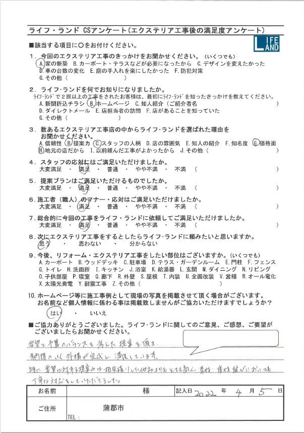 | ライフ・ランドを選んだ理由 | 提案力、スタッフの人柄、価格面、地元の店だから |