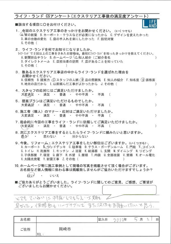 ていねいな対応、価格面においてお客様にご満足していただくことができ、大変うれしく思います。