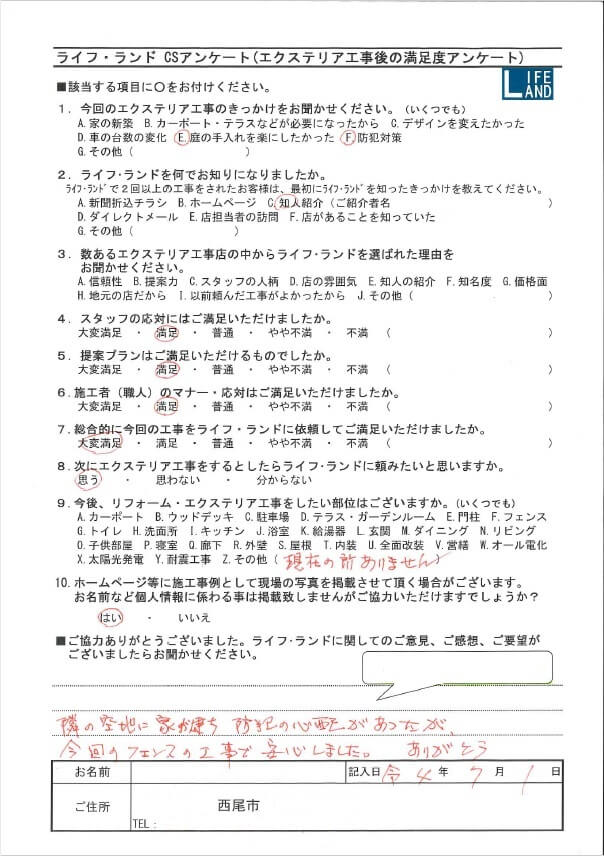防犯の心配があったが、今回のフェンスの工事で安心しました