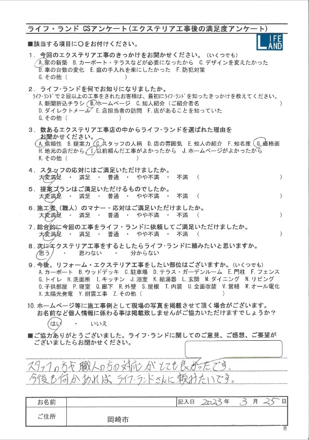 | ライフ・ランドを選んだ理由 | 信頼性、スタッフの人柄、価格面、以前頼んだ工事がよかったから |