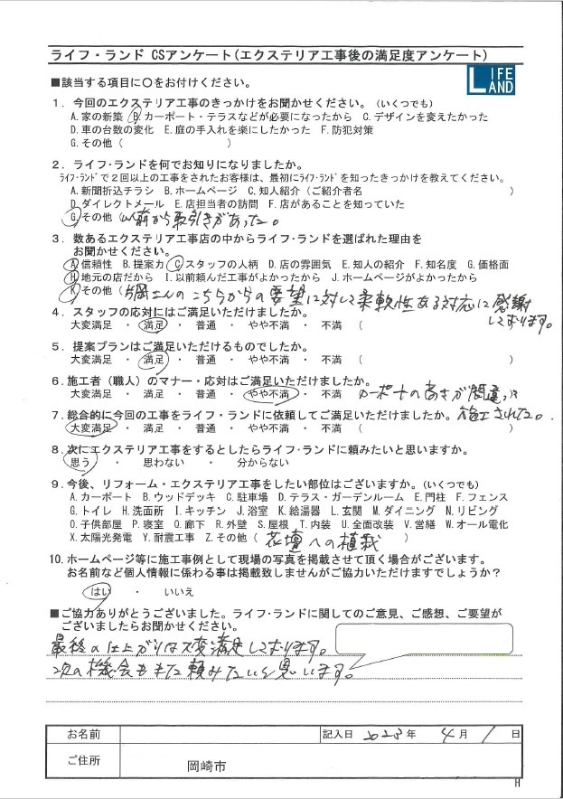 ライフ・ランドを選んだ理由 | 信頼性、スタッフの人柄、地元の店だから、その他(片岡さんのこちらからの要望に対して柔軟性ある対応に感謝しております。) |