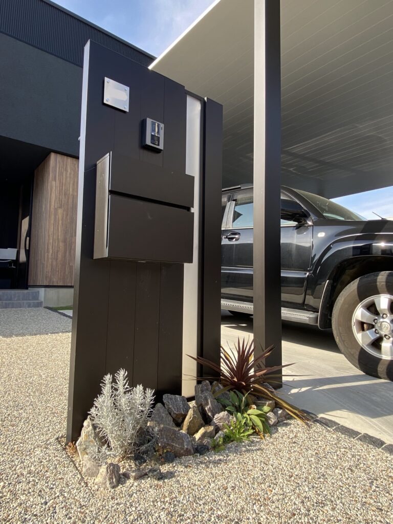 機能門柱はブラックで統一され、装飾パネルがアクセントの重厚感のあるタイプのものを選ばれました。