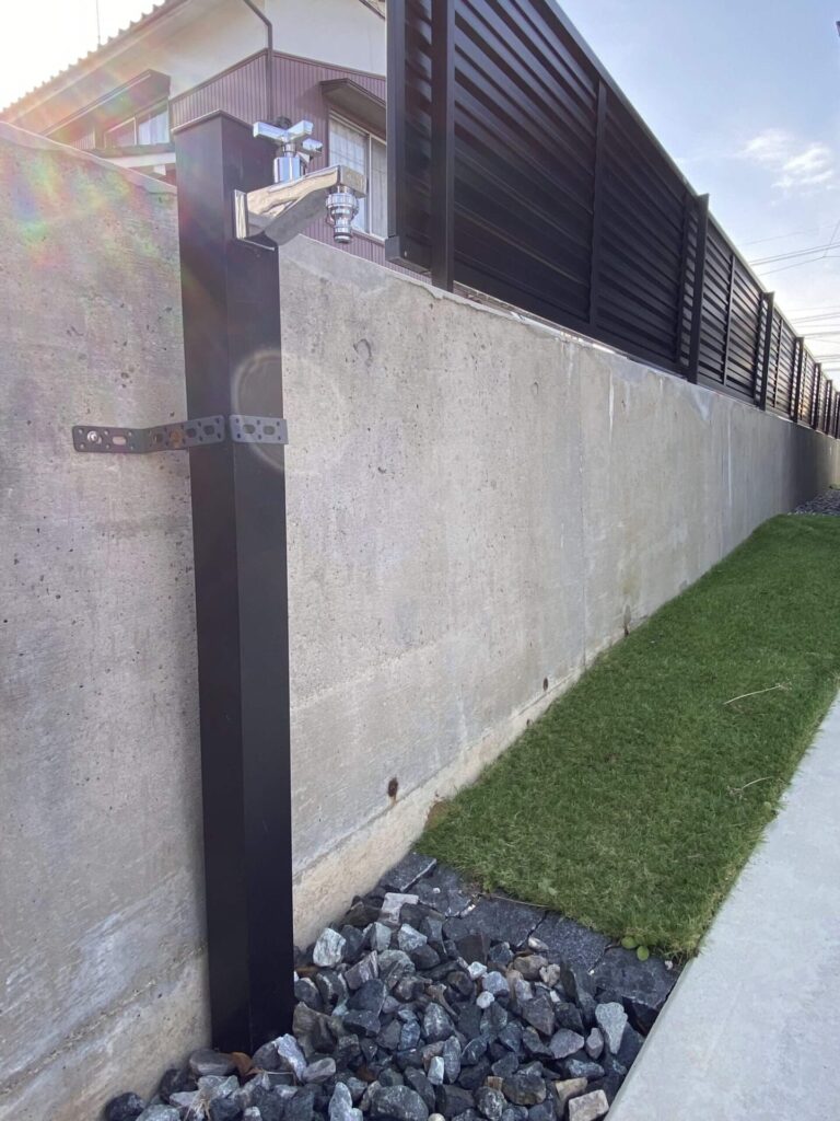 立水栓は駐車場側とお庭側の2ヶ所設置し、駐車場側にはパンの代わりに、砕石で水を受けるようにしています。